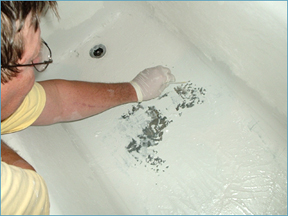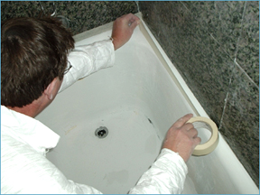 El proceso de renovación del acabado se inicia con la preparación del lugar de trabajo. Un potente sistema de ventilación se pone en el lugar de trabajo para ventilar los gases al exterior. El área que rodea la bañera es protegida.